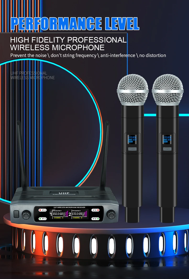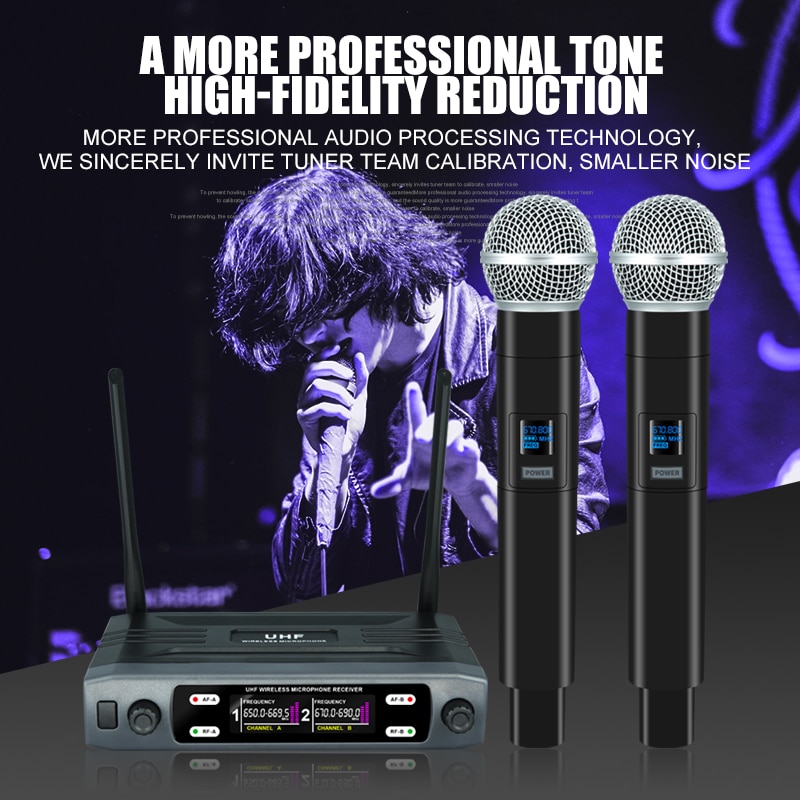 Microfone sem fio portátil de dois canais UHF frequência fixa microfone dinâmico para karaokê festa de casamento banda show na igreja